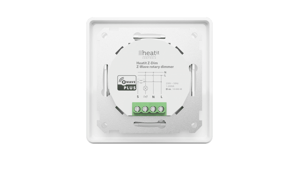 Heatit Z-Dim is a rotary Z-Wave dimmer for many different types of light sources. Heatit Z-Dim works at low loads without making the lights flicker. It dims 1-200VA LED bulbs, dimmable LED drivers and electronic transformers. L + N wires must be connected.