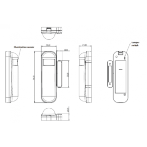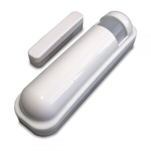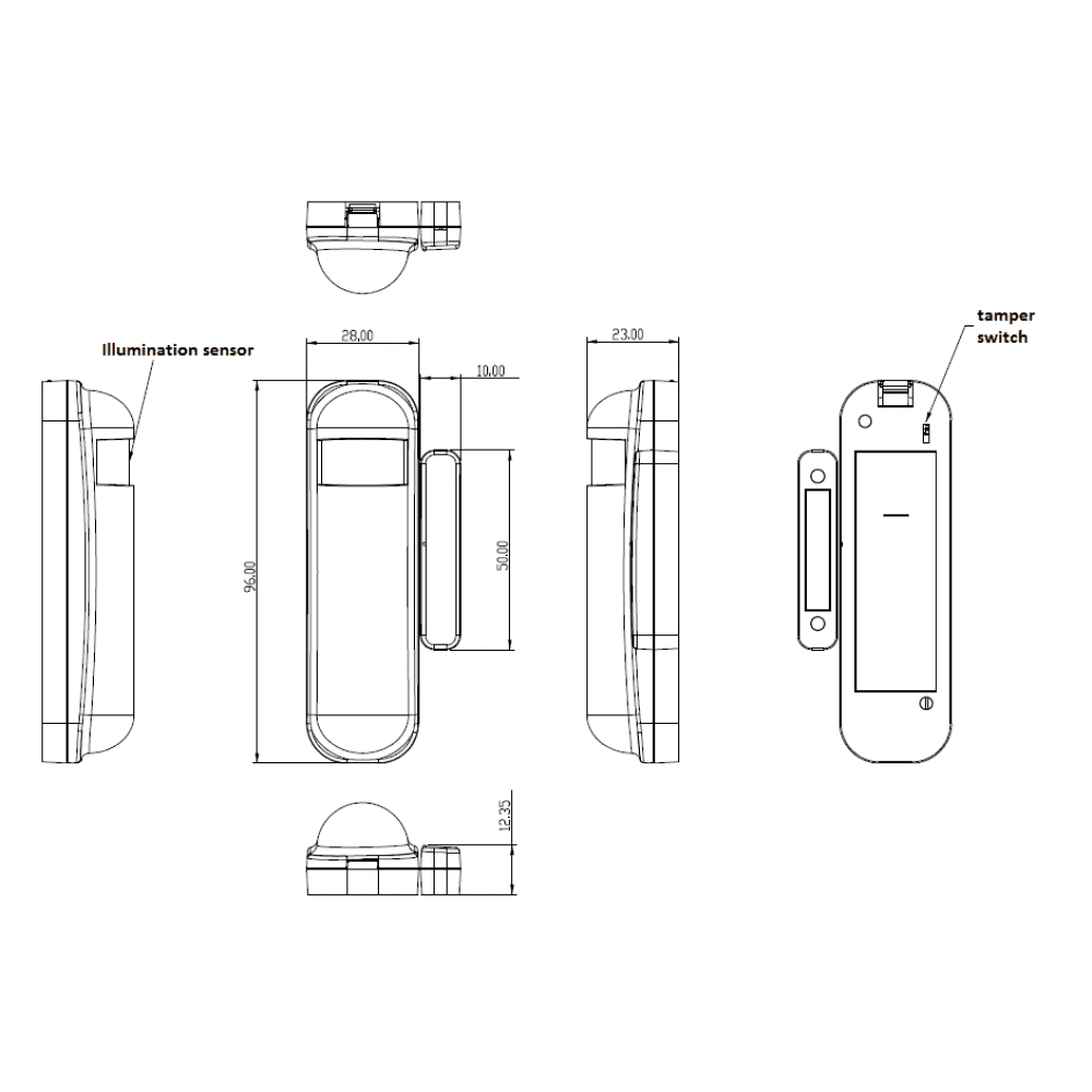It consists of two parts: a sensor and a magnet with dimensions of 28 x 96 x 23 mm on the multisensor and 10 x 50 x 12 mm on the magnetic part. They are designed to be mounted on a door or window, with the magnetic part on the opening part and the sensor on the fixed part.