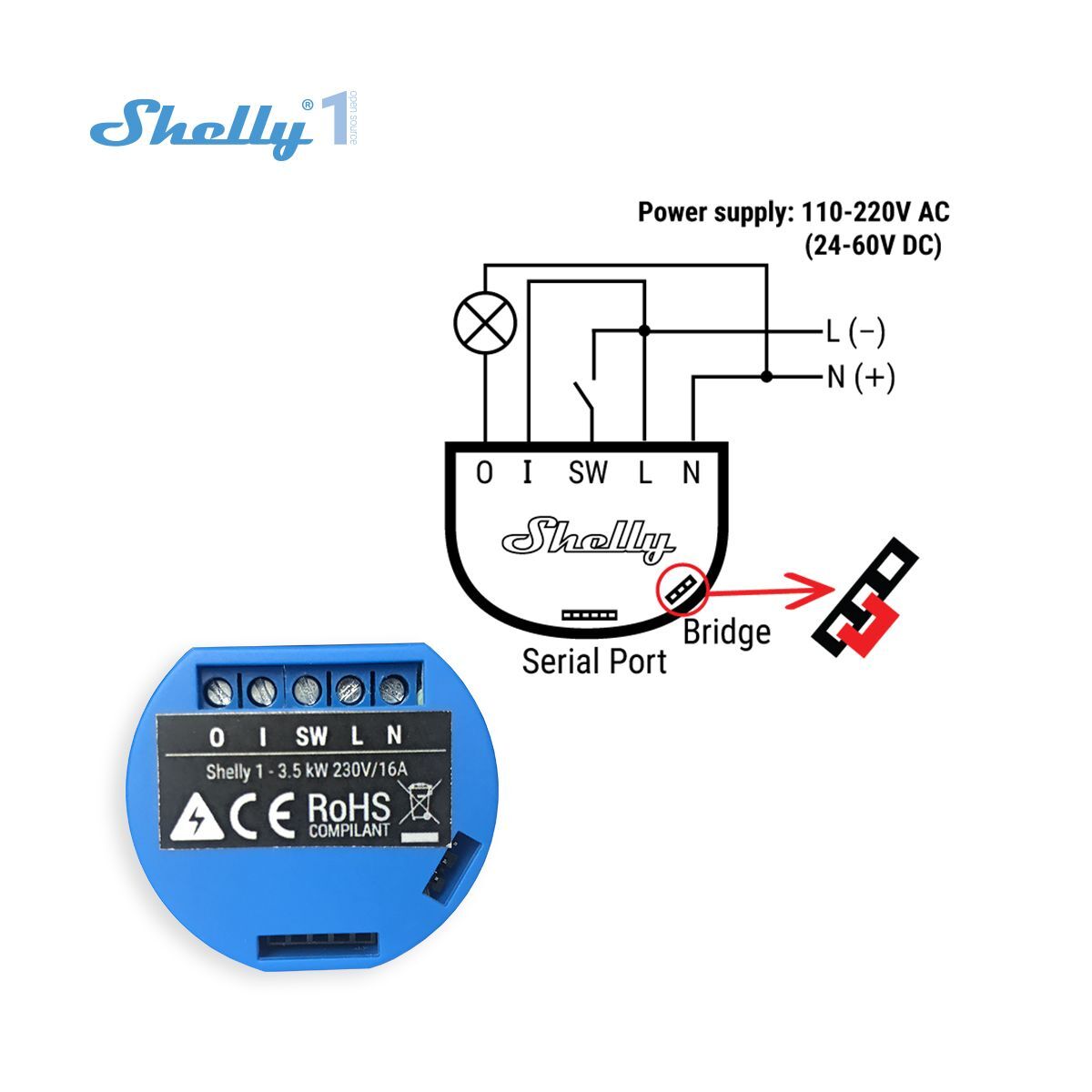 Shelly 1 controls an electrical circuit, e.g. lighting, up to 3.5kW. The device is available for monitoring and control, allowing remote control of electrical circuits via mobile phone, computer or home automation system.